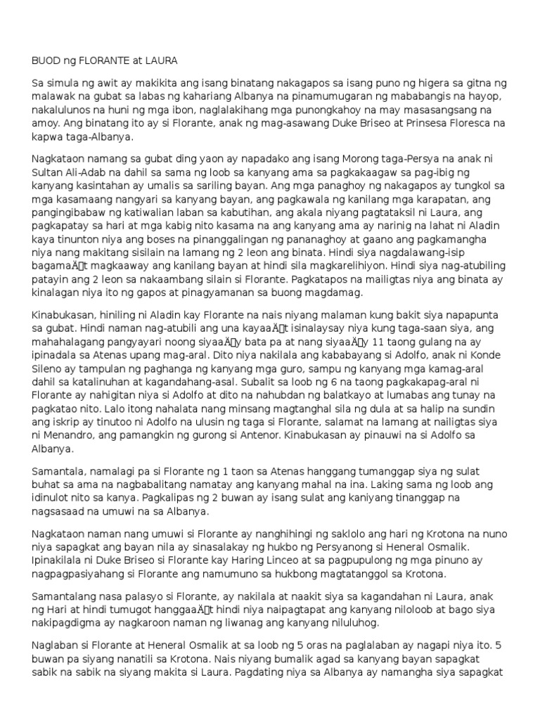 Buod Ng Florante at Laura Documents. Bagaman ito ay may kaawa-awang itsura ay bakas pa rin sa kaniyang mukha ang mala-Adonis na itsura. Ang kuwento ng Florante at Laura ay nagsisimula sa isang madilim na gubat sa may dakong labas ng bayang Albanya malapit sa ilog Kositong na ang tubig ay makamandagDito naghihimutok ang nakataling Florante na inusig ng.