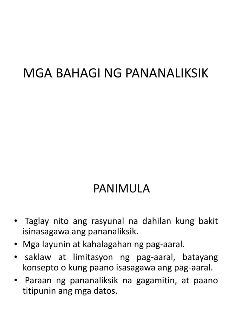 23-09-2019 Uri ng pananaliksik batay sa pakay 1. PowerPoint Presentation Bahagi ng Sulating Pananaliksik NOTE. Maikling kaligiran ng paksa layunin ng mananaliksik pahayag ng tesis o thesis statement kahalagahan ng paksa o kahalagahan ng pagsasagawa ng pananaliksik at saklaw at limitasyon ng pananaliksik.