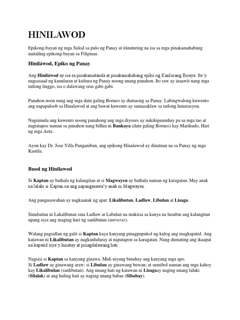 Hinilawod Docx Hinilawod Epikong Bayan Ng Mga Sulod Sa Pulo Ng Panay At Itinuturing Na Isa Sa Mga Pinakamahab U00e0ng Naital U00e2ng Epikong Bayan Sa Course Hero