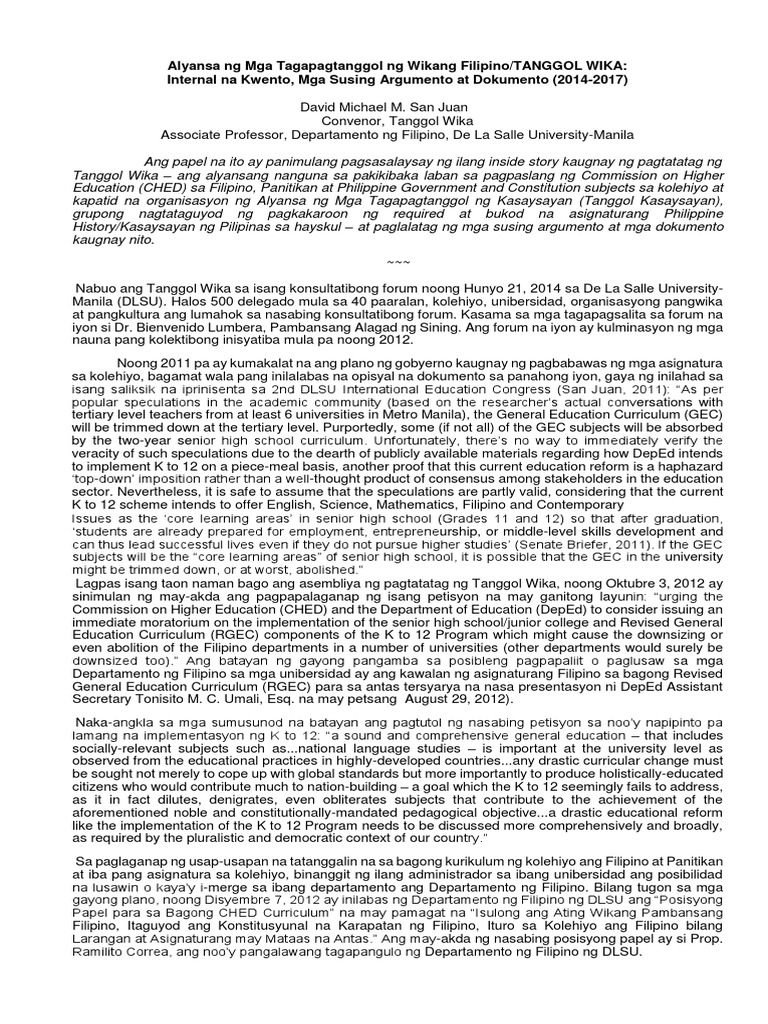 D Docx 1 Sulong Wikang Filipino Edukasyong Pilipino Para Kanino D Nire May Banta O Panganib Na Tanggalin Ang Pag Aaral Ng Wikang Filipino Bilang Core Course Hero