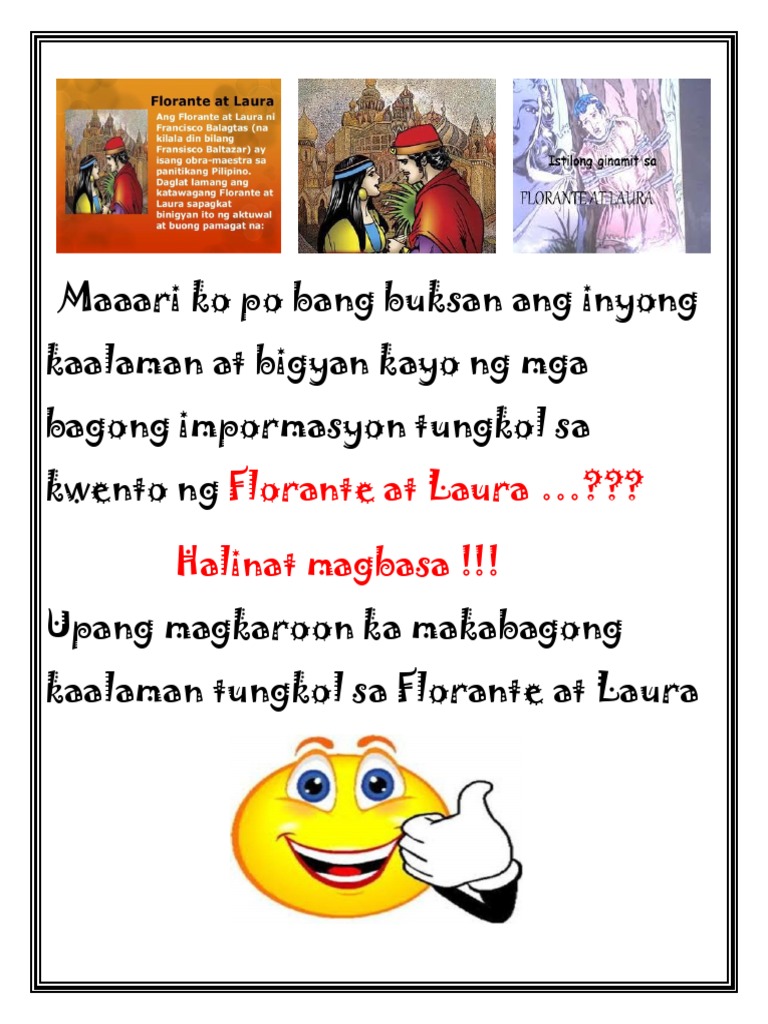Dating pamagat ng florante at laura. Sa madlng cuadro histrico o pinturang nagsasabi sa mg. Nangyari nang unang panahn sa imperyo ng Gresya at tinul.
