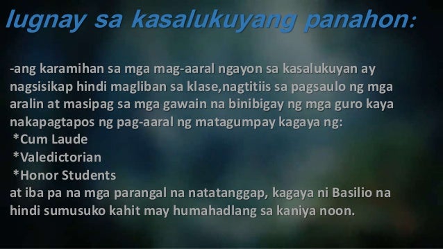 Basilio Madilim ang gabi at si Basilio ay patuloy na naglalakad tungo sa kadiliman makalipas ang kalahating oras sumapit siya sa isang batis kung saan may nakatindig na tila punso sa kabilang pampang nito at isang maitim at walang hugis na bunton na mistulang isang bundok sa kadiliman. Buod ng Kabanata 1-10 1. Minsan ang kagalingan ay ikinukubli lamang at inilalabas sa tamang pagkakataon.