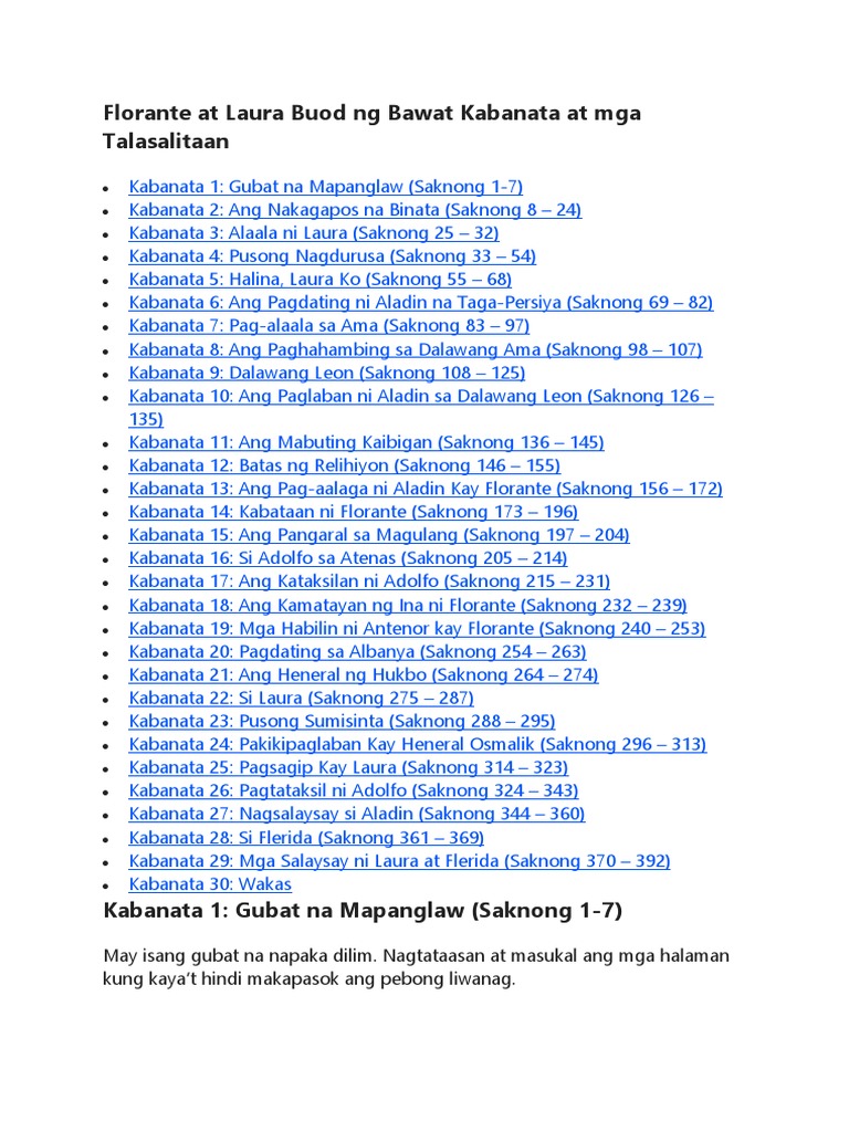 BUOD NG BAWAT KABANATA NG FLORANTE AT LAURA PDF. Nang mapakinggan ni Aladin ang mga daing ni Florante ay agad niyang naisip ang kanyang ama at hindi niya napigilang umiyak. Nang makarinig ang gerero ng iyak ni Florante siyay namangha kaya naman sinundan niya kung saan nanggagaling ang boses ng nagsasalita at dumating siya sa pinanggagalingan ng boses at narinig niya si Florante na umiiyak dahil sa pagkamatay ng kanyang ama.